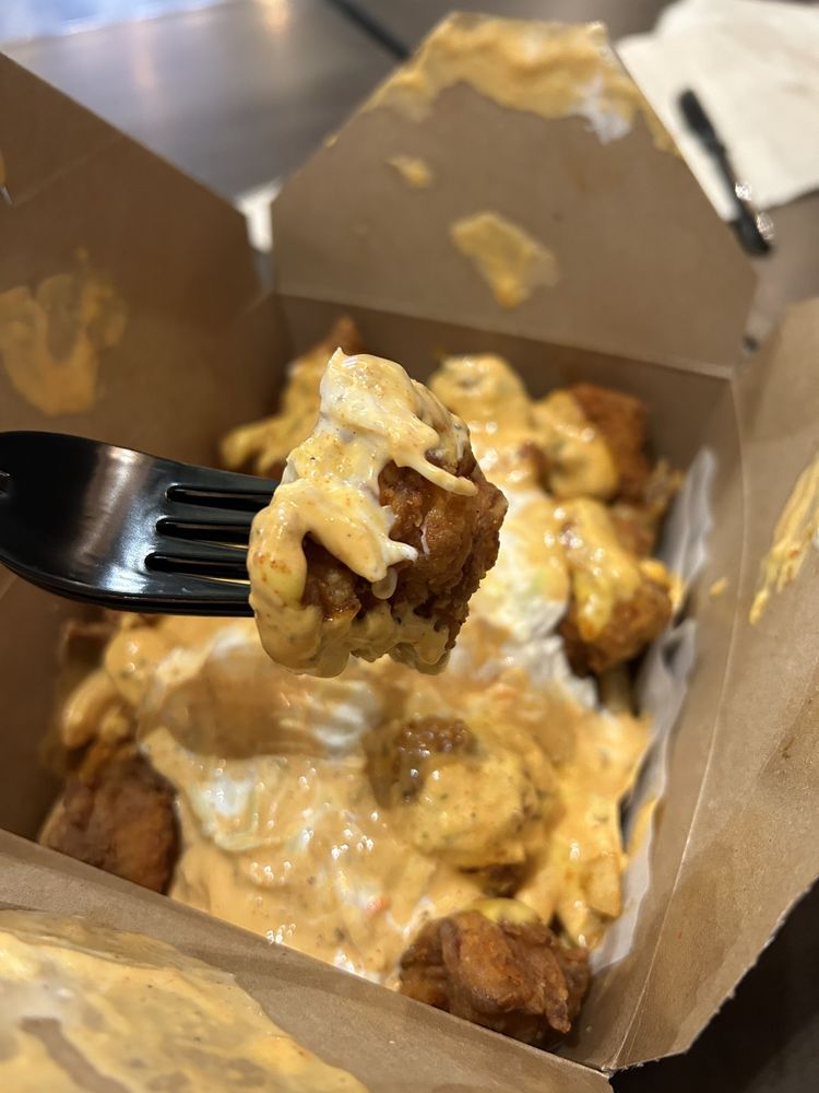 Fries topped with Chi-sauce, cheese, coleslaw, spice and popcorn chicken.